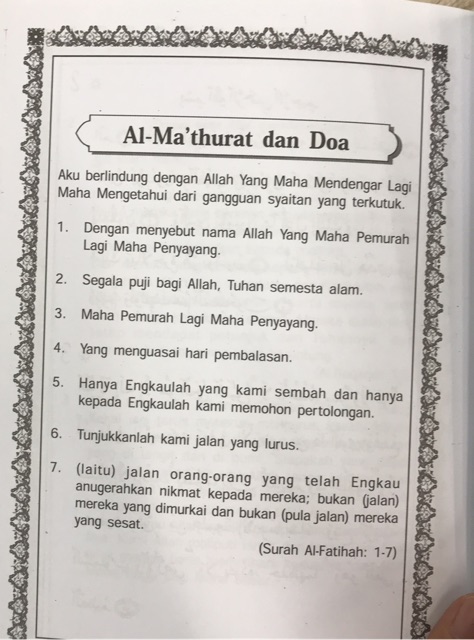Kemalangan akibat tumpuan terganggu Khirulnizam Abd Rahman. Dibagian akhir artikel Sahabat juga dapat mendengarkan audio doa almatsurat ini sekaligus mendownload. Sahabat belajaralquranid artikel kali ini adalah tentang doa al matsurat sebuah dzikir yang dibaca setiap pagi dan sorepetang dan tulisan ini adalah bacaan almatsurat lengkap kubro dan sugro untuk bacaan shugro hanya ada sedikit pengurangan bacaan.