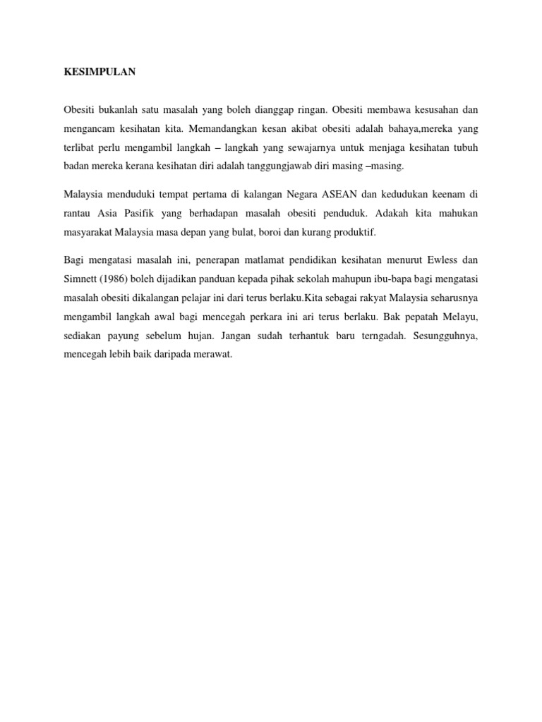 Pengenalan Masalah obesiti di Malaysia masih berterusan. Keadaan itu menyebabkan peningkatan kegemukan dalam kalangan kanak-kanak sebanyak dua kali ganda iaitu 58 peratus kanak-kanak obes pada 2011 meningkat kepada hampir 12 peratus pada 2015. Masalah obesiti ini juga semakin ketara di kalangan remaja berumur 13-17 tahun.